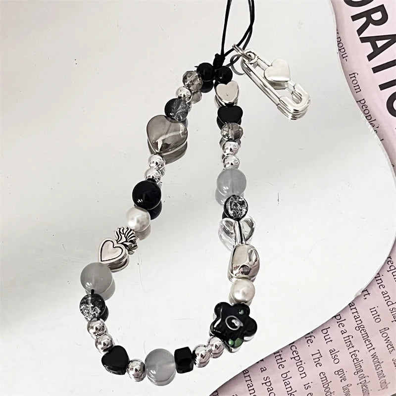 Bracelet Y2K avec charm cœur et pendentif fleur, parfait pour personnaliser votre téléphone avec élégance.