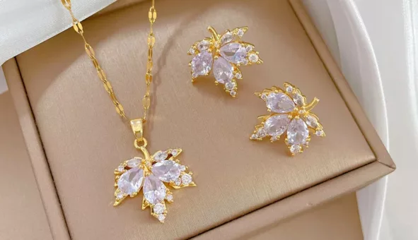 Découvrez notre ensemble collier et boucles d'oreilles en feuille d'érable blanc, une touche d'élégance pour toute occasion !