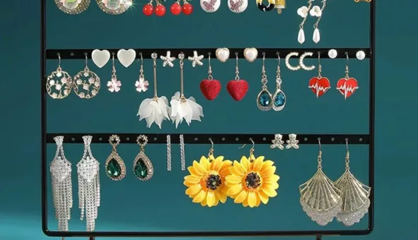 Rangement élégant pour vos boucles d'oreilles, avec présentoir en métal et bois. Pratique et chic, idéal comme cadeau.