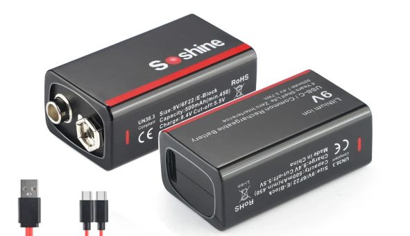 Batterie Lithium-Ion rechargeable 9V Soshine 500mAh : faible auto-décharge, longue durée, et affichage LED pratique.