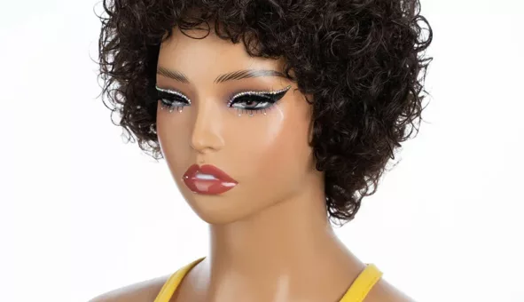 Perruque Bouclée Kinky Pixie avec frange, conçue en cheveux humains. Style naturel et chic pour chaque occasion.