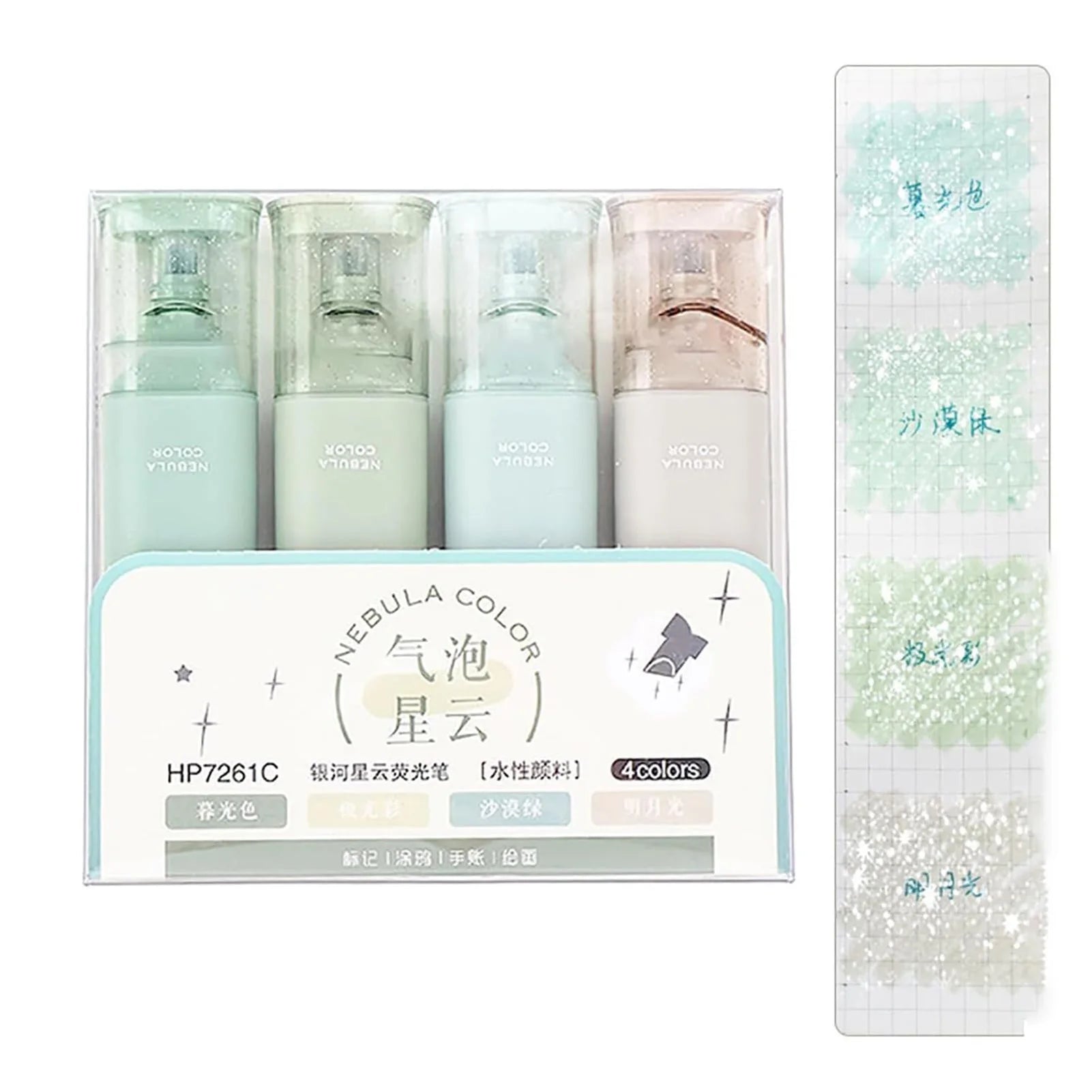 Accroche : Illuminez votre travail quotidien avec ce lot de 4 surligneurs pailletés aux couleurs nébuleuses, parfaits pour vos planificateurs, journaux et notes.