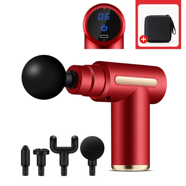 Mini pistolet de massage avec 6 vitesses et 4 têtes. Soulage douleurs musculaires, compact et transportable!