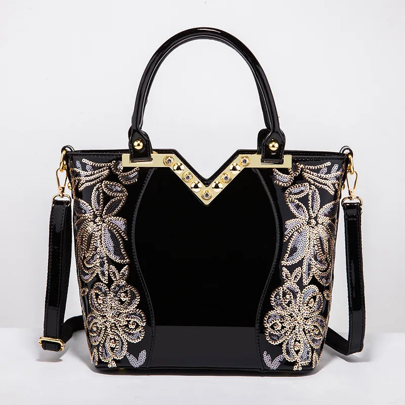 Découvrez le parfait allié de votre style avec ce sac à main en cuir verni, sublimé par une broderie florale délicate et des détails scintillants.